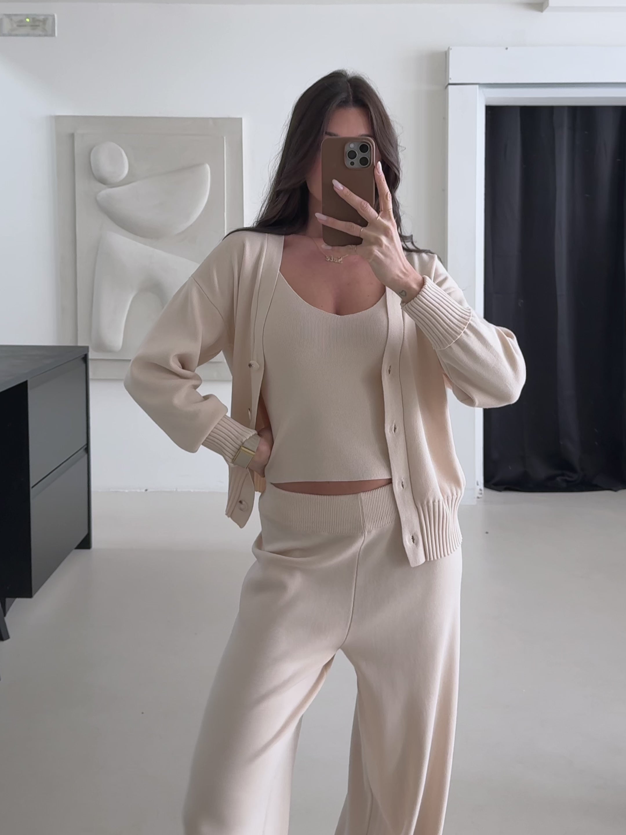 Set coordinato composto da ampio pantalone con elastico in vita, canotta basic con spallina sottile e cardigan con bottoni.