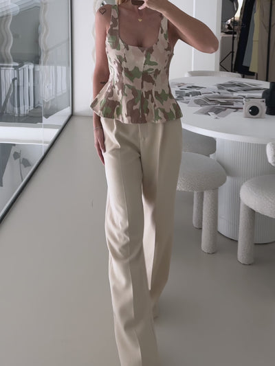 Top in denim con stampa camouflage, fondo svasato e chiusura con zip sul retro.